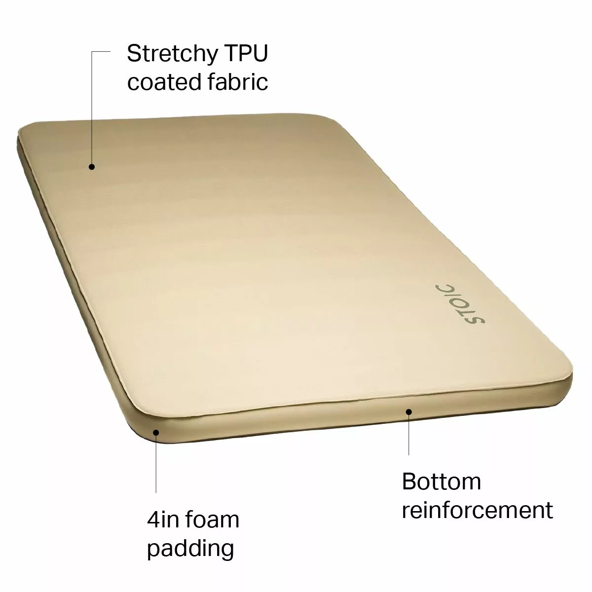 The Cloud Camp Bed is Stoic’s comfiest sleeping pad, so we followed the same recipe and sized it up for two campers. It uses plenty of foam to offer all the cushioning you need to sleep soundly. Its soft, stretchy fabric has a TPU coating to protect from wet weather should you sleep outside the tent, and the bottom is reinforced to stay solid on rocky grounds.